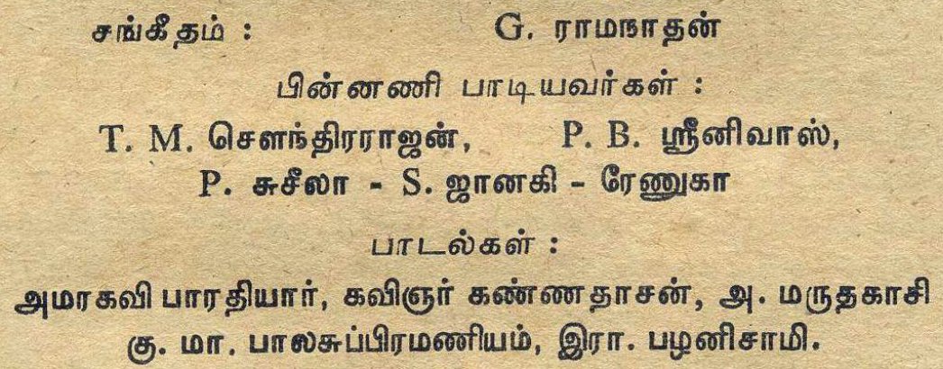 Singers: TMS, P.Susheela, P.B.Sreenivas, S.Janaki, A.L.Raghavan & Renuka Lyrics: Subramania Bharathi, Kannadasan, Ku.Ma.Balasubramaniam, A.Maruthakasi, Pazhanisami