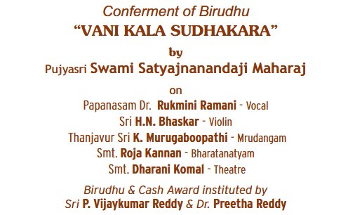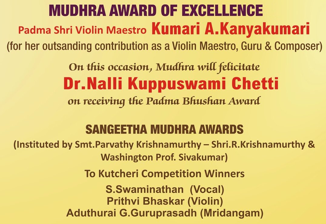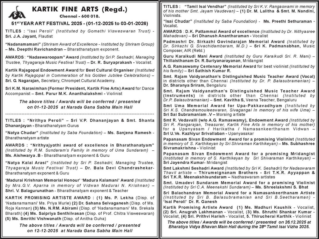 | December (Madras) Chennai Music Season Awards 2025 - 2026 * Bharat Kalachar DR. MRS YGP AWARD FOR CULTURAL EXCELLENCE - Vyjayanthimala Bali (at the birth centenary celebration of educationist Dr. YGP organized by Bharat Kalachar) ![]() * Brahma Gana Sabha Gaana Padhmam - Neyveli S.Santhanagopalan Vaadhya Padhmam - Mannargudi A.Easwaran Naatya Padhmam - Meenakshi Chitharanjan Naataka Padhmam - Mapillai Ganesh * Gayatri Fine Arts and Gayatri Fine Arts Global - Vishwa Sangeetha Seva Visharadha - V.V.Sundaram - Sangeetha Seva Visharadha - Subhasree Thanikachalam * Kartik Fine Arts - NADANAMAMANI - Deepthi Ravichandran (Bharatanatyam) - NRITHYA PEROLI - The Dhananjayans (Bharatanatyam) - ISAI PEROLI - J.A. Jayant (Flute) - NADHASWAROOPAM AWARD - Dr.R.Suryaprakash (Vocal) - NATYA CHUDAR - Sanjena Ramesh (Bharatanatyam) - Nrithyajyothi award of excellence in Bharatanatyam - Aishwarya.B (Bharatanatyam) - Natya Kala Arasi - Bala Devi Chandrashekar (Bharatanatyam) - Madurai Krishnan Memorial Honour 'Madura Kalamani' - V.Balagurunathan (Bharatanatyam) - Shri K.M. Narasimhan award - Parur M.K.Ananthalakshmi (dance accompanist, Violinist) - Kartik promising artiste award - P.Lekha, Sahana Selvaganesh, N.RM. Abirami, Saipriya Senthilvasan, Smrithi Vishwanath - Kartik Rajagopal Endowment Award for Best Cultural Organiser - G.Nagarajan (Sec., Chrompet Cultural Academy) ![]() * Lakshminarayana Global Music Festival Lakshminarayana International Award - A.R.Rahman * Mudhra ![]() * Nada Sudha - Nada Vallabha award - V.Rajkumar Bharathi (Vocal), T.V.Ramanujacharlu (Violin), Trichur C.Narendran (mridangam), D.Balakrishna (Venna) - Meritorius Service in Fine arts award - Mudhraa Bhaskar and Radha Bhaskar - Nada Pallava awards to young talented artists * Sri Krishna Gana Sabha SANGEETHA CHOODAMANI - K.V.Prasad (Mridangam) NRITHYA CHOODAMANI - G Narendra (Bharatanatyam) * Sri Parthasarathy Swami Sabha ![]() ![]() SANGEETHA KALASARATHY - Prof. V.V. SUBRAHMANYAM (Violin Maestro), VISHAKHA HARI ( Harikatha Exponent) Lifetime contribution ACHARYA SARATHY - RAMA RAVI, Dr. R. K. PADMANABHA Palghat Mani Iyer Centenary Award - T.G. MUTHUKUMARASAMY (Thavil) Dwaram Venkataswami Naidu Award - V.V.S. MURARI Gottuvadyam Narayana Iyengar Award for Musical Excellence - NIRMALA RAJASEKAR Veena Pichumani Iyer Centenary Award - Mudikondan S. N. RAMESH Kalpagam Swaminathan Award - MANGALAM SHANKAR Pudukkottai Dakshinamurthy Pillai Award - M. MANOJ SIVA (Mrudangam), B. GANAPATHY RAMAN (Mrudangam) Isai Methai G. Ramanathan Award - VIDYA KALYANARAMAN Dr. M.L. Vasanthakumari Award - SHRUTHI SHANKAR KUMAR * Sri Thyaga Brahma Gana Sabha ![]() * Tamil Isai Sangam Isaiperaringnar - Chitra Visweswaran (Bharatanatyam) Pann Isaiperaringnar - Kudandhai V.Lakshmanan * The Music Academy Sangita Kalanidhi - R.K.Shriramkumar (Violin) Nritya Kalanidhi - Urmila Satyanarayana (Bharatanatyam) Sangita Kala Acharya - Shyamala Venkateswaran (Vocal), Thanjavur R.Govindarajan (Tavil) TTK award - Madambi Subramania Namboothri (Kathakali Music), J.T.Jeyaraaj Krishnan and Jaysri Jeyaraaj Krishnan (Veena) Musicologist award - Prof. C.A.Sridhara Details |