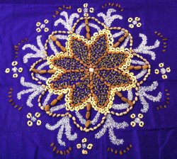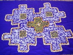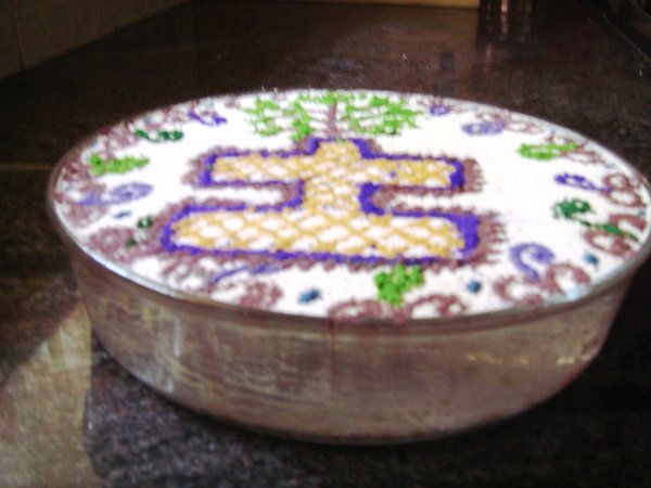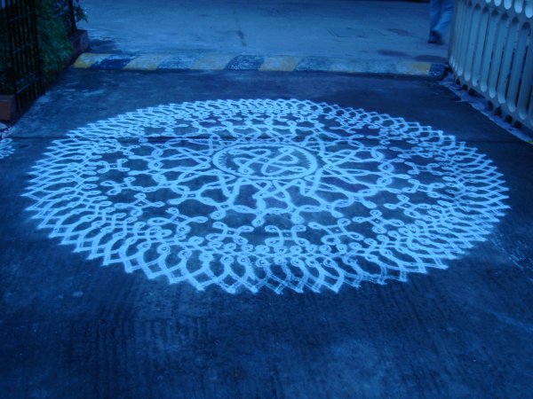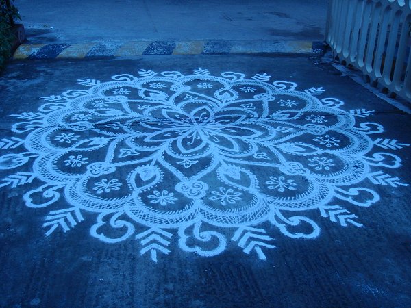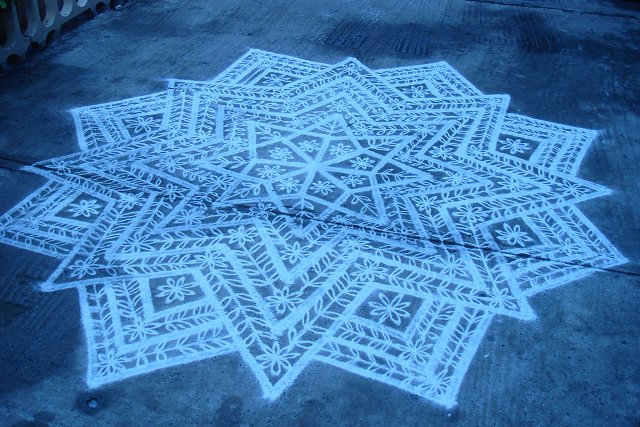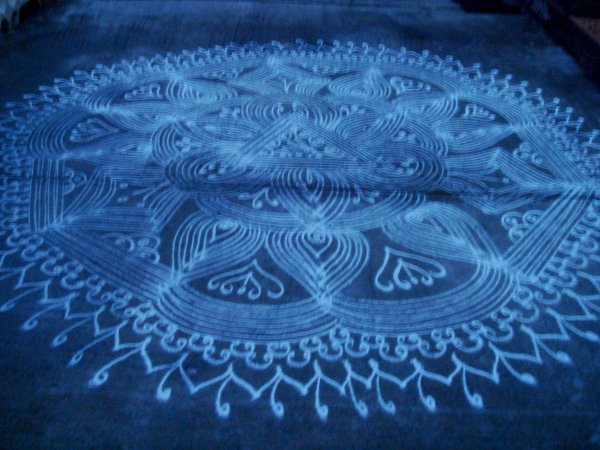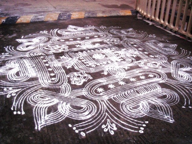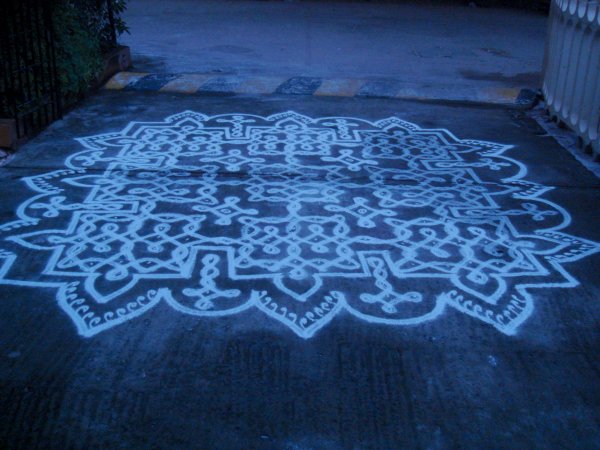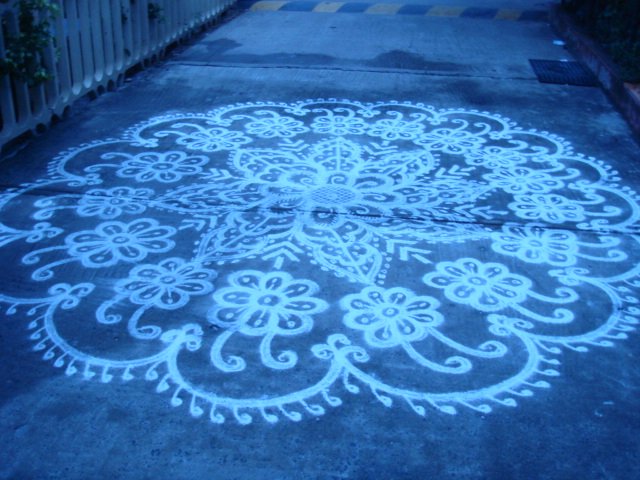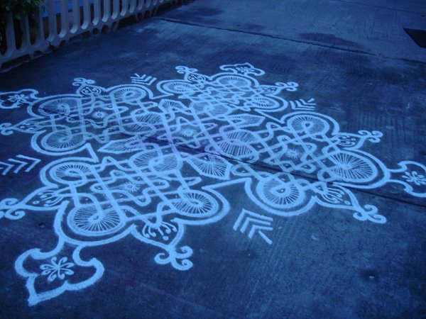 We created a kolam, inspired by the sankeerthana "BRAHMAMOKKATAY PARABRAHMAMOKKATAY"