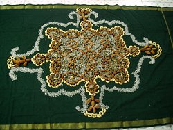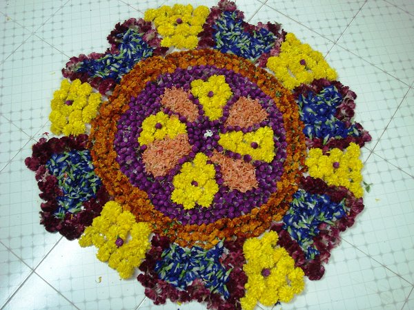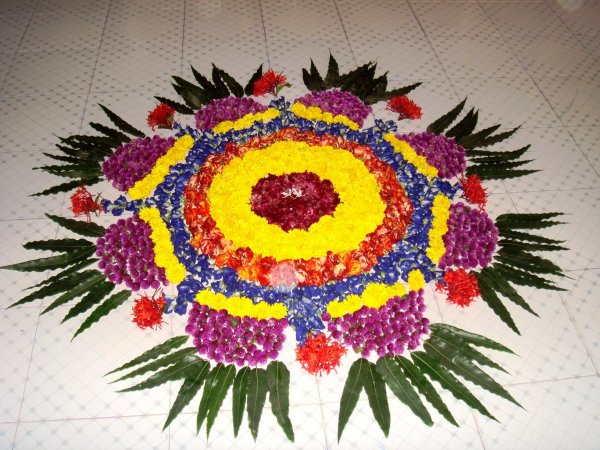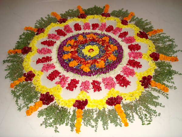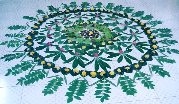 Rangoli using leaves and flowers by Lakshmi Raghu