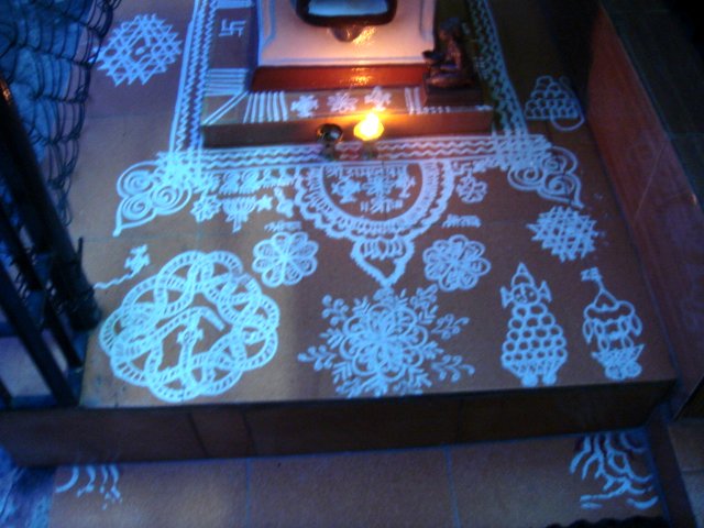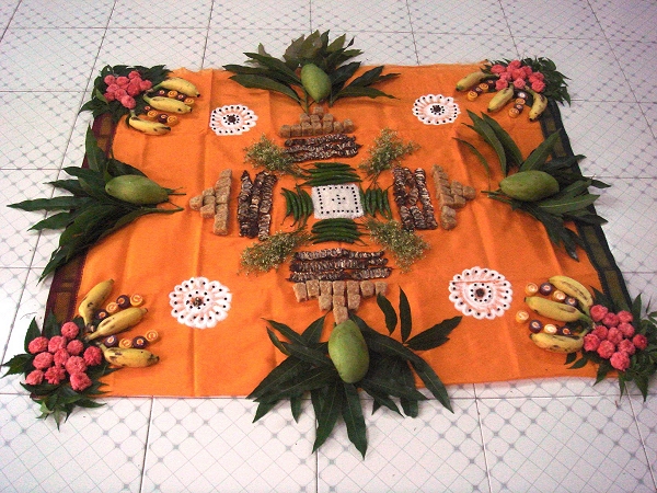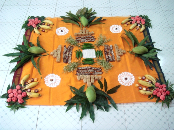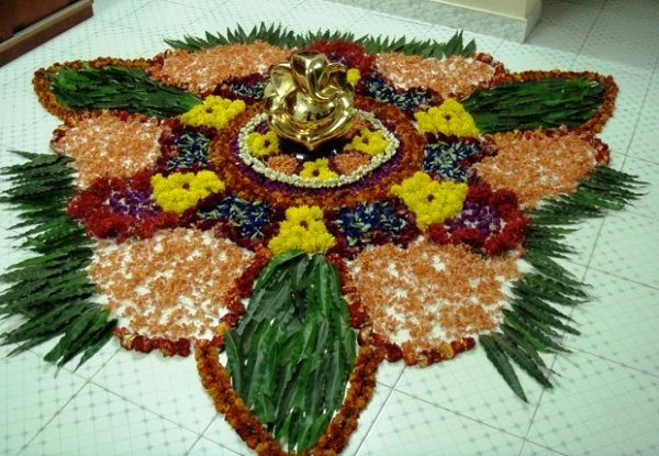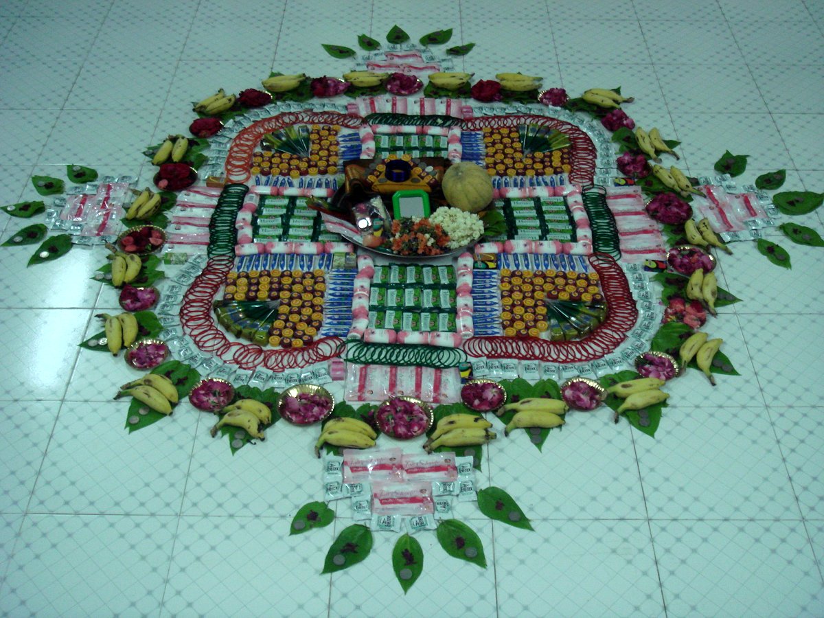 The kolam is created with mango leaves, neem leaves, flowers, bananas. turmeric, kumkum boxes are only for decoration.