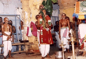 worn by Vishnu as the temple idol. The garland and the cymbals the arayers