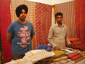 Worked by the peasant women of Pujab, Phulkari odhanis or shawls are intricately woven into the cultural life of the high-spirited, hard working people of the region. They form an important part of the bridal dress, are given away as dowry and worn on all festive occasions. Even in death, a married woman's bier is covered by finely worked Phulkari. The base of the embroidery is hand spun, hand-woven khaddar, generally in shades of red. The unique feature of the craft is that it involves the use of only one stitch - the simple darn. The stitches are worked on the wrong side of the cloth with silk thread called 'pat' in Punjabi, to produce a smooth silken sheen on the surface. The predominant colours of white, yellow, orange, red, green and magenta are arranged to give a stunning kaleidoscope effect. All kinds of human and animal figures are worked on rare "sanchi' Phulkaris, which are highly prized by connoisseurs of art. In the more common Phulkaris, floral motifs and geometric designs produce a rich mosaic-like impression.
