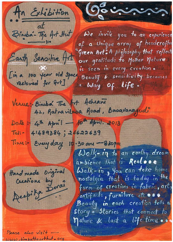 Earth Sensitive Art - an exhibition of works by artist Deepika Dorai. Art and artefacts created over the last few years in and around the 100 year old building restored by her and in surrounding spaces architected and handcrafted from Earthy features - a reflection of life values that tells many a story in handmade Green Art.