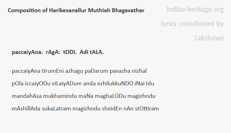 paccaiyAna. rAgA: tODi. Adi tAlA. - Composition of Harikesanallur Muthiah Bhagavathar