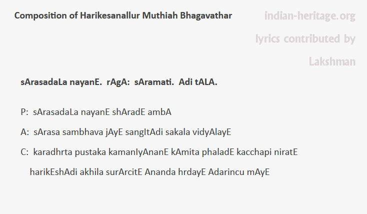 sArasadaLa nayanE. rAgA: sAramati. Adi tALA. - Composition of Harikesanallur Muthiah Bhagavathar