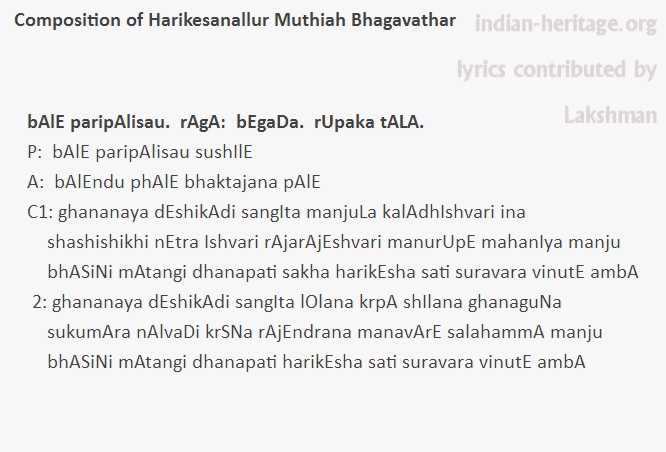 bAlE paripAlisau. rAgA: bEgaDa. rUpaka tALA. - Composition of Harikesanallur Muthiah Bhagavathar