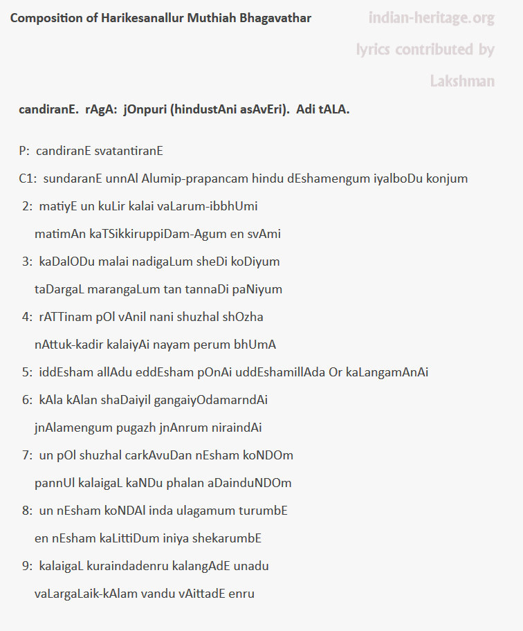 candiranE. rAgA: jOnpuri (hindustAni asAvEri). Adi tALA. - Composition of Harikesanallur Muthiah Bhagavathar