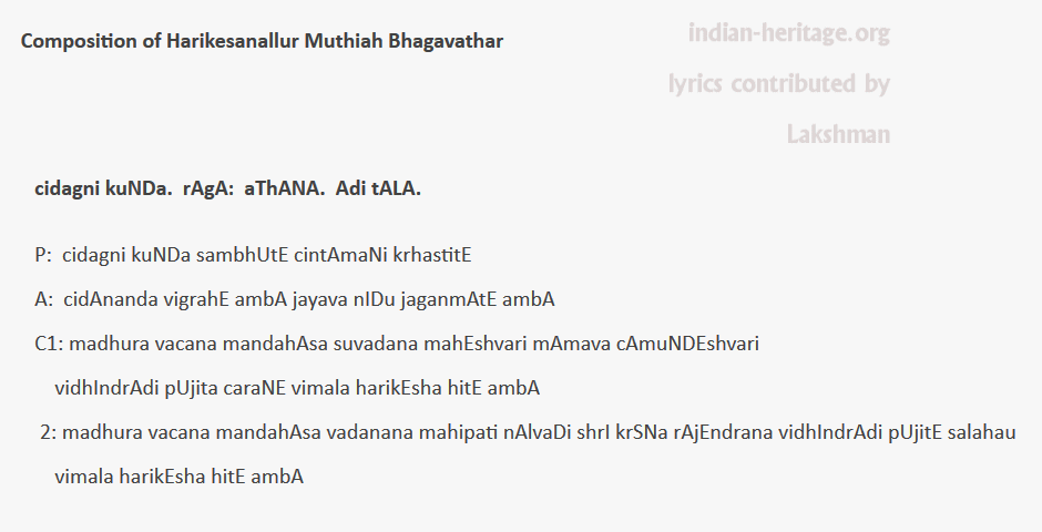 cidagni kuNDa. rAgA: aThANA. Adi tALA. - Composition of Harikesanallur Muthiah Bhagavathar