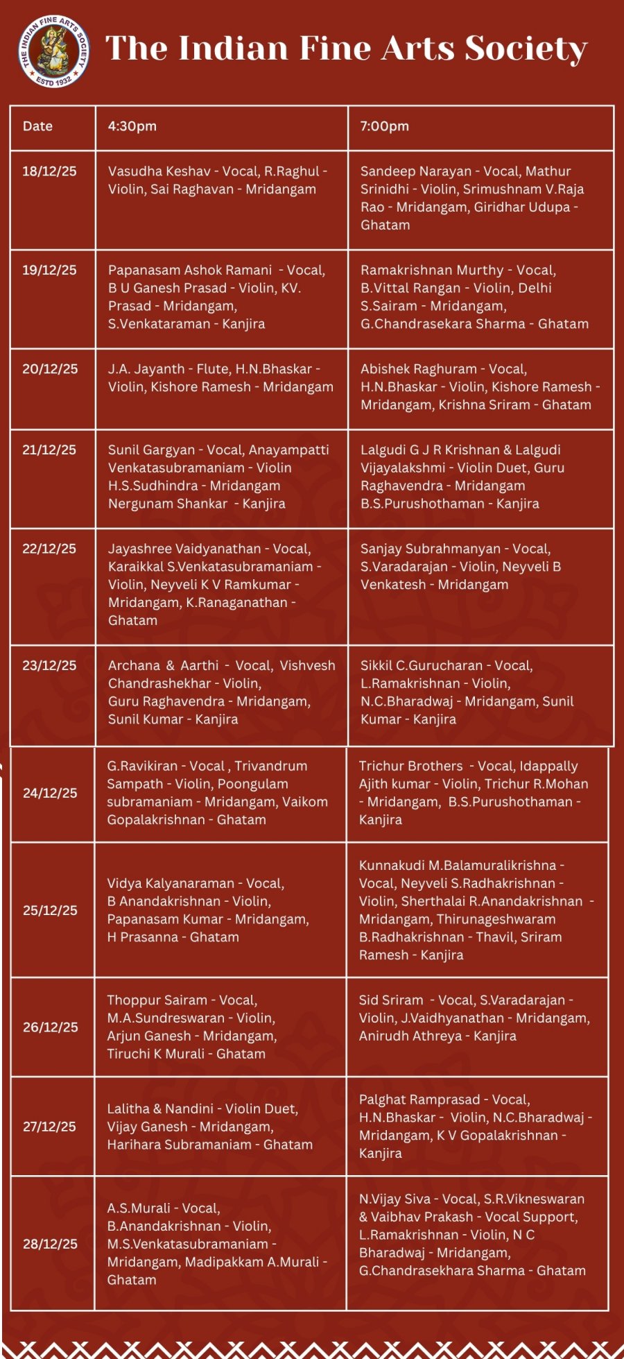 Schedule for 2025 - 2026 93rd South Indian Music Conference & Festival (17 - 31 Dec 2025) Venue: Ethiraj Kalyana Nilayam, 87 TTK Rd, Alwarpet, Chennai Info: +91 78457 55481 ![]() Only evening programmes schedule from MDnD fb ![]() |