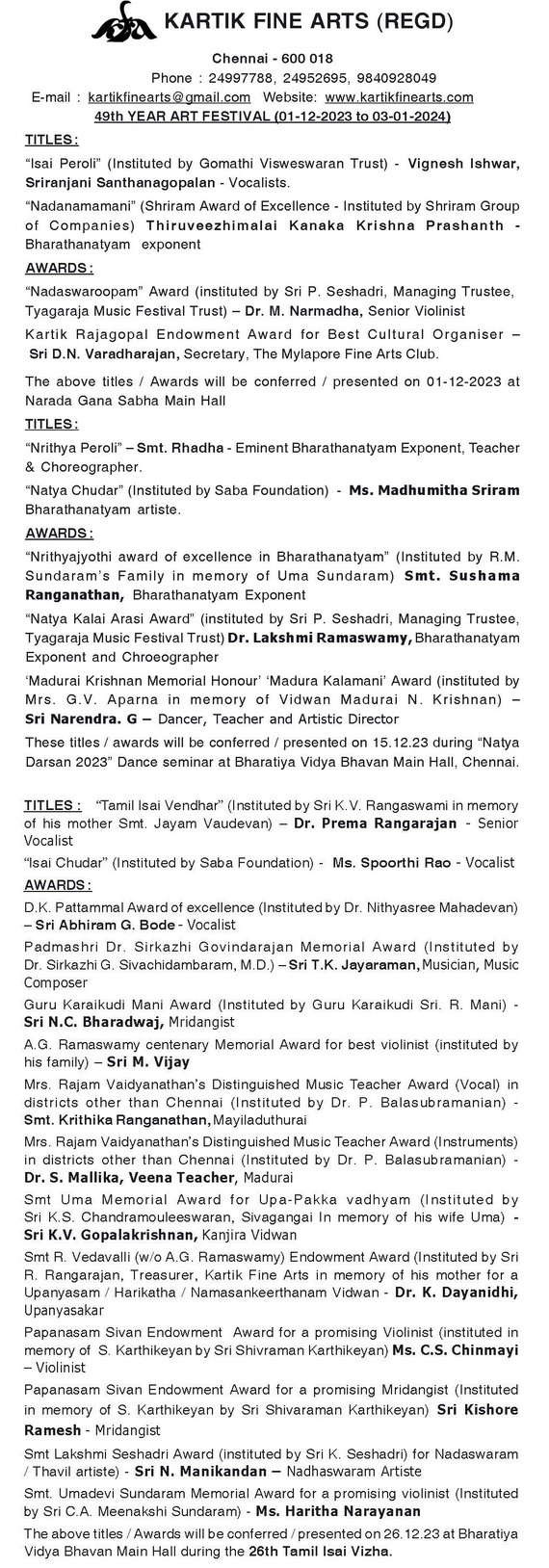 | Awards 2023 - 2024 * Bharat Kalachar Gnana Kala Bharathi (Dr Mrs YGP Memorial Award) - Dr. Rajkumar Bharathi Viswa Kala Bharathi - Nartaki Nataraj Acharya Kala Bharathi - Urmila Sathyanarayanan Nataka Kala Bharathi - Bala Sundaram Kala Seva Bharathi - Bhagavata Mela Melattur Kumar Yuva Kala Bharathi - Music: Dr. Rangapriya - Violin, Rishabh Ranganathan- Violin, Visvak Kumaran - Mrdngm, Spoorthi Rao - Vocal, Rahul Vellal - Vocal, V.G.Vigneswar - Keyboard Yuva Kala Bharathi - Dance: Bhairavi Venkatesan- BN, Lekha Prasad - BN, Arthi Vasudevan - Kuchipudi, Sharmada Viswanath - BN, Samanvita Sasidharan- All Rounder (Rajam Pushpavanam Memorial Award) Special commendation: Sai Shravanam - Soundscape, VVS Manian - Konnakkol, Lavanya Venugopal - Theatre K Balachander AWARD Of Excellence - S Sureshwar * Kartik Fine Arts ![]() * RR Sabha After a gap of a few years, Chennai’s RR Sabha honoured 13 artistes in the Award function held at the Sabha premises on August 18, 2023. LIFETIME ACHIEVEMENT: Dr. Padma Subrahmanyam (cash award Rs.1,25,000) NRUTYA KALA RATNA: Priyadarsini Govind (cash award Rs.1,00,000) KALA SEVA RATNA: VR Devika (cash award Rs.50,000) NRUTYA YUVA KALA RATNA: Sudharma Vaithiyanathan (cash award Rs.25,000) * Sri Krishna Gana Sabha Nritya Choodamani - Dr. Sreelatha Vinod (Bharatanatyam) Sangeetha Choodamani - Mysore Nagaraj and Mysore Manjunath * Sri Parthasarathy Swami Sabha Sangeetha Kalasarathy: Violin Maestro NAGAI R. MURALIDHARAN Presenting Palghat Mani Iyer Centenary award to Mridangam Maestro Dr. YELLA VENKATESHWARA RAO Partha Acharya Puraskar: Vainika, Guru & Musicologist Dr. R.S. JAYALAKSHMI Gottuvadyam Narayana Iyengar Award for Musical Excellence to Ghatam Maestro Dr. SURESH VAIDYANATHAN Dwaram Venkataswami Naidu Award to Violin Vidwan VITTAL RAMAMURTHY G. Ramanathan Award to Media Fame, Producer, Arts Curator. SUBHASREE THANIKACHALAM Dr. M.L.V. Award to Sri.Kalyanapuram S. ARAVIND and VITTAL RANGAN * Sri Thyaga Brahma Gana Sabha Vani Kala Sudhakara title Malladi Brothers - Sri Sreerama Prasad & Sri Ravi Kumar - Vocal Dr. Usha Rajagopalan - Violin Neyveli Sri B. Venkatesh - Mrudangam Meenakshi Chitharanjan - Bharatanatyam R.S. Kumar - Theatre * The Music Academy Sangita Kalanidhi - Bombay Jayashri (carnatic vocalist) Nritya Kalanidhi - Vasanthalakshmi Narasimhachari (Bharatanatyam, Kuchipudi) Sangita Kala Acharya - Palkulangara Ambika Devi (carnatic vocalist) & K.S.Kalidas (mridangam) TTK award - Thirunageswaram T.R.Subramaniam (Thavil) & Sargurunatha Odhuvar (Thirumurai) Musicologist award - Dr.Arimalam S.Padmanabhan (researcher) |