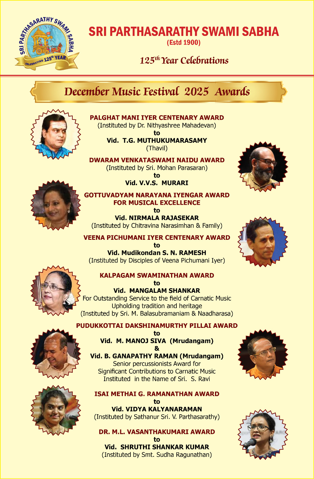 | December (Madras) Chennai Music Season Awards 2025 - 2026 * Bharat Kalachar DR. MRS YGP AWARD FOR CULTURAL EXCELLENCE - Vyjayanthimala Bali (at the birth centenary celebration of educationist Dr. YGP organized by Bharat Kalachar) ![]() * Brahma Gana Sabha Gaana Padhmam - Neyveli S.Santhanagopalan Vaadhya Padhmam - Mannargudi A.Easwaran Naatya Padhmam - Meenakshi Chitharanjan Naataka Padhmam - Mapillai Ganesh * Gayatri Fine Arts and Gayatri Fine Arts Global - Vishwa Sangeetha Seva Visharadha - V.V.Sundaram - Sangeetha Seva Visharadha - Subhasree Thanikachalam * Kartik Fine Arts - NADANAMAMANI - Deepthi Ravichandran (Bharatanatyam) - NRITHYA PEROLI - The Dhananjayans (Bharatanatyam) - ISAI PEROLI - J.A. Jayant (Flute) - NADHASWAROOPAM AWARD - Dr.R.Suryaprakash (Vocal) - NATYA CHUDAR - Sanjena Ramesh (Bharatanatyam) - Nrithyajyothi award of excellence in Bharatanatyam - Aishwarya.B (Bharatanatyam) - Natya Kala Arasi - Bala Devi Chandrashekar (Bharatanatyam) - Madurai Krishnan Memorial Honour 'Madura Kalamani' - V.Balagurunathan (Bharatanatyam) - Shri K.M. Narasimhan award - Parur M.K.Ananthalakshmi (dance accompanist, Violinist) - Kartik promising artiste award - P.Lekha, Sahana Selvaganesh, N.RM. Abirami, Saipriya Senthilvasan, Smrithi Vishwanath - Kartik Rajagopal Endowment Award for Best Cultural Organiser - G.Nagarajan (Sec., Chrompet Cultural Academy) ![]() * Lakshminarayana Global Music Festival Lakshminarayana International Award - A.R.Rahman * Mudhra ![]() * Nada Sudha - Nada Vallabha award - V.Rajkumar Bharathi (Vocal), T.V.Ramanujacharlu (Violin), Trichur C.Narendran (mridangam), D.Balakrishna (Venna) - Meritorius Service in Fine arts award - Mudhraa Bhaskar and Radha Bhaskar - Nada Pallava awards to young talented artists * Sri Krishna Gana Sabha SANGEETHA CHOODAMANI - K.V.Prasad (Mridangam) NRITHYA CHOODAMANI - G Narendra (Bharatanatyam) * Sri Parthasarathy Swami Sabha ![]() ![]() SANGEETHA KALASARATHY - Prof. V.V. SUBRAHMANYAM (Violin Maestro), VISHAKHA HARI ( Harikatha Exponent) Lifetime contribution ACHARYA SARATHY - RAMA RAVI, Dr. R. K. PADMANABHA Palghat Mani Iyer Centenary Award - T.G. MUTHUKUMARASAMY (Thavil) Dwaram Venkataswami Naidu Award - V.V.S. MURARI Gottuvadyam Narayana Iyengar Award for Musical Excellence - NIRMALA RAJASEKAR Veena Pichumani Iyer Centenary Award - Mudikondan S. N. RAMESH Kalpagam Swaminathan Award - MANGALAM SHANKAR Pudukkottai Dakshinamurthy Pillai Award - M. MANOJ SIVA (Mrudangam), B. GANAPATHY RAMAN (Mrudangam) Isai Methai G. Ramanathan Award - VIDYA KALYANARAMAN Dr. M.L. Vasanthakumari Award - SHRUTHI SHANKAR KUMAR * Sri Thyaga Brahma Gana Sabha ![]() * Tamil Isai Sangam Isaiperaringnar - Chitra Visweswaran (Bharatanatyam) Pann Isaiperaringnar - Kudandhai V.Lakshmanan * The Music Academy Sangita Kalanidhi - R.K.Shriramkumar (Violin) Nritya Kalanidhi - Urmila Satyanarayana (Bharatanatyam) Sangita Kala Acharya - Shyamala Venkateswaran (Vocal), Thanjavur R.Govindarajan (Tavil) TTK award - Madambi Subramania Namboothri (Kathakali Music), J.T.Jeyaraaj Krishnan and Jaysri Jeyaraaj Krishnan (Veena) Musicologist award - Prof. C.A.Sridhara Details |