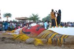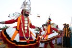 The final battle between Duryodhana and Bhima, and the conclusion of the play The Eighteenth Day, takes in the early morning. During the night an enormous edifice of Duryodhana has been made from sand, mud and water at a place near the stage. Two actors in the roles of Duryodhana and Bhima (they may be different performers from those who did the 'on-stage' play) engage in a fight, which may take on such violent overtones that they have to be kept separate by a rope hold up on both sides by a number of villagers. Bhima chases Duryodhana and they hit each other repeatedly. The fatal blow on Duryodhana's thigh, the place where he invited Draupadi to sit and his vulnerable spot, hits the sand-figure, not the real actor. It smashes a pot of red water that has been hidden into the thigh of the sand-figure, spilling symbolically the blood of Duryodhana. Once Duryodhana has been killed, Draupadi mounts the sand-figure and one of the actors ties up her hair in fulfilment of the vow she has made at the assembly of the Kauravas.
